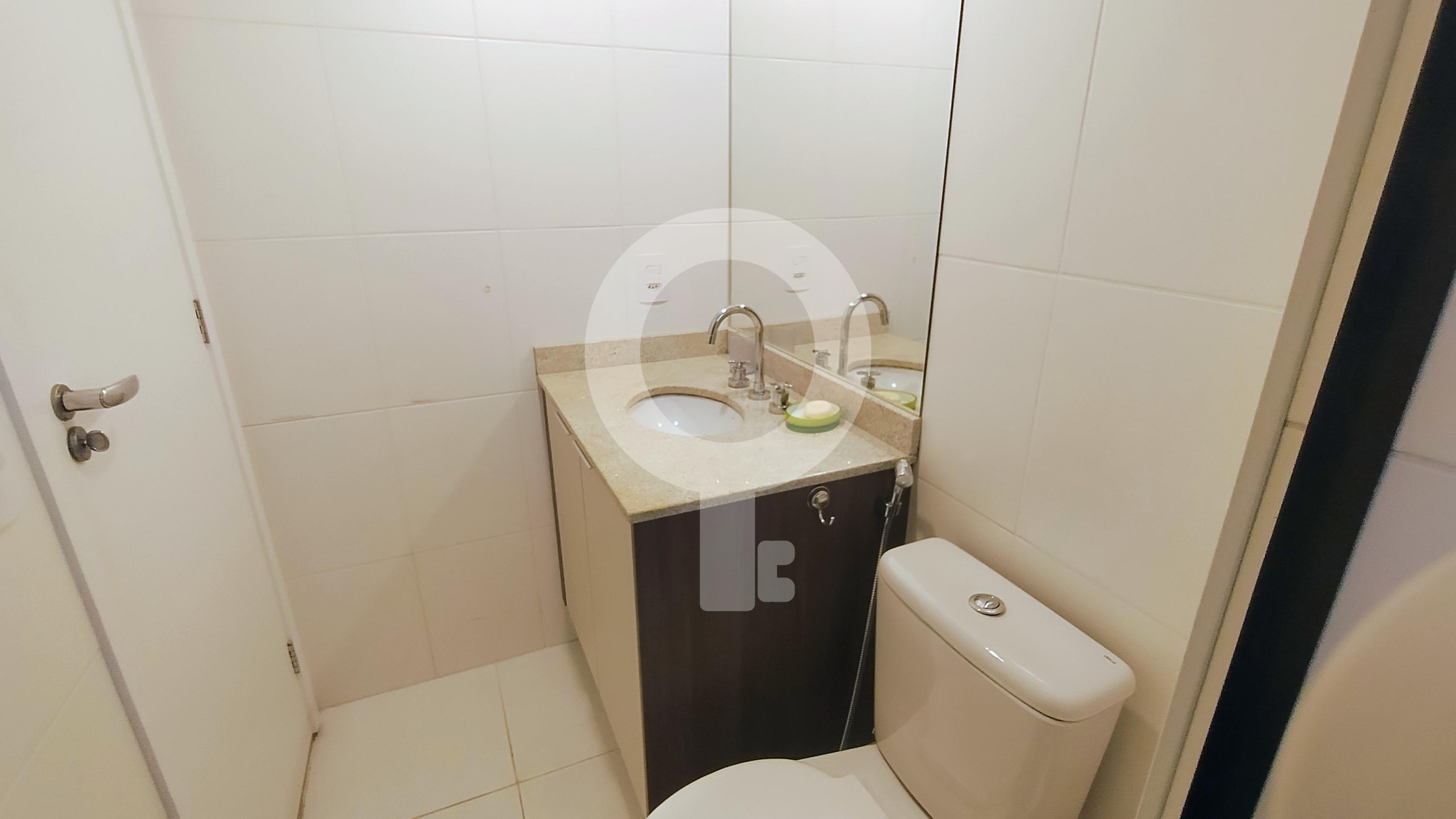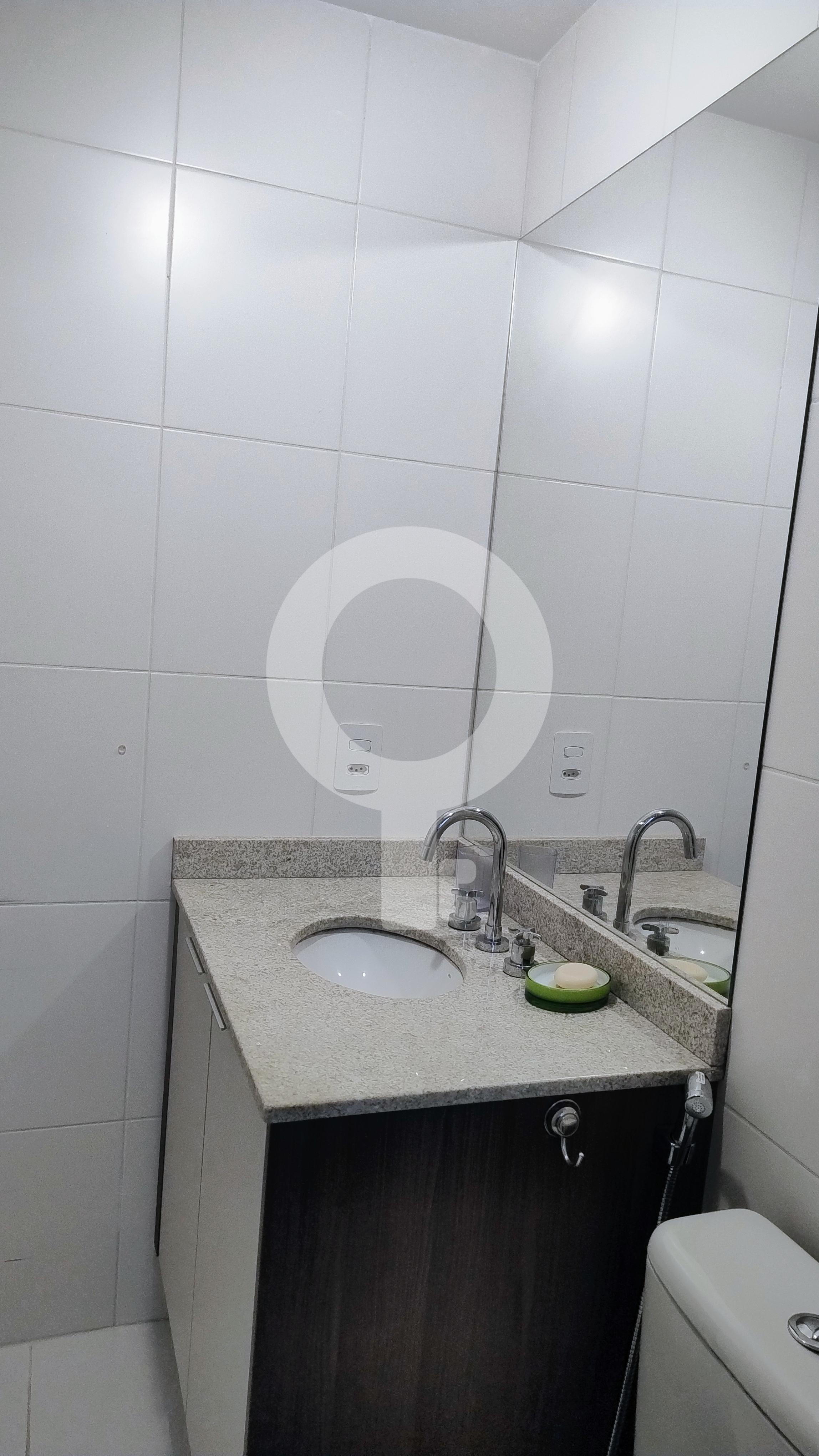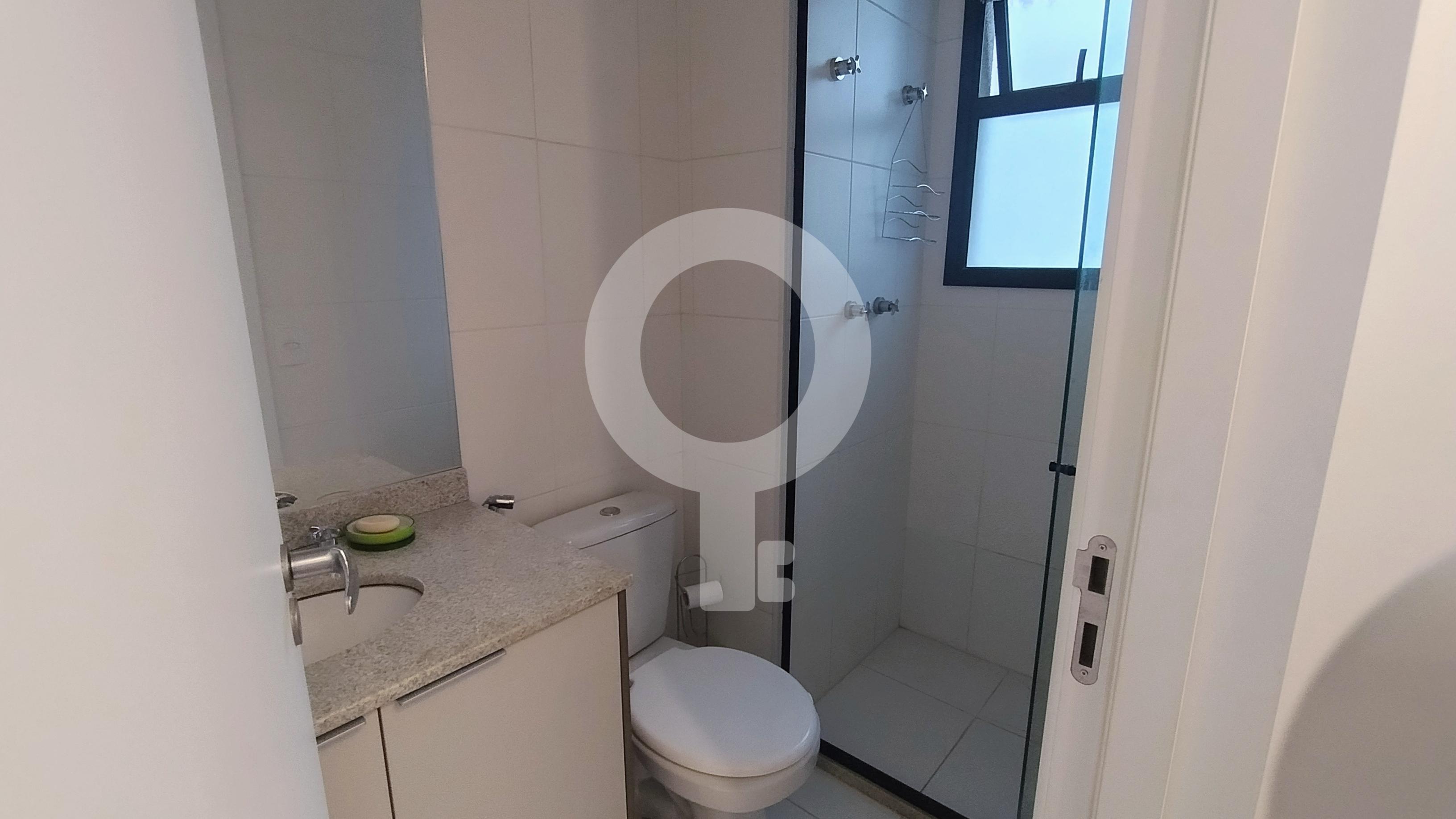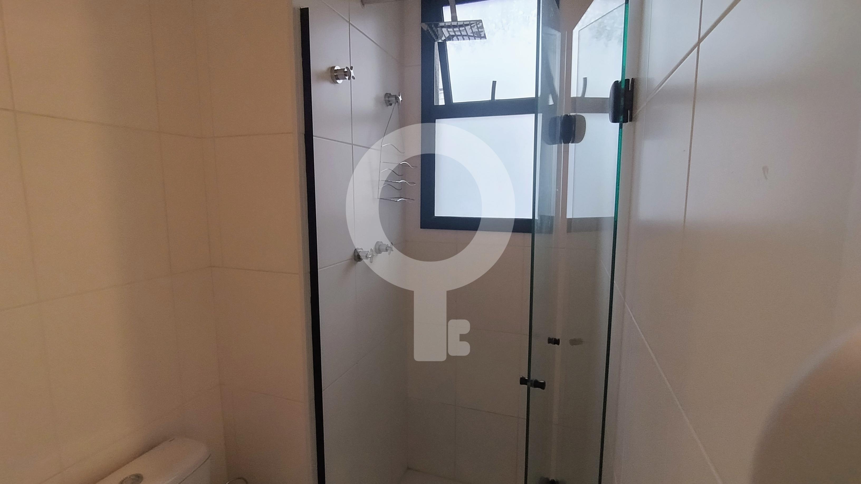 Banheiro com box blindex, gabinete e armário
